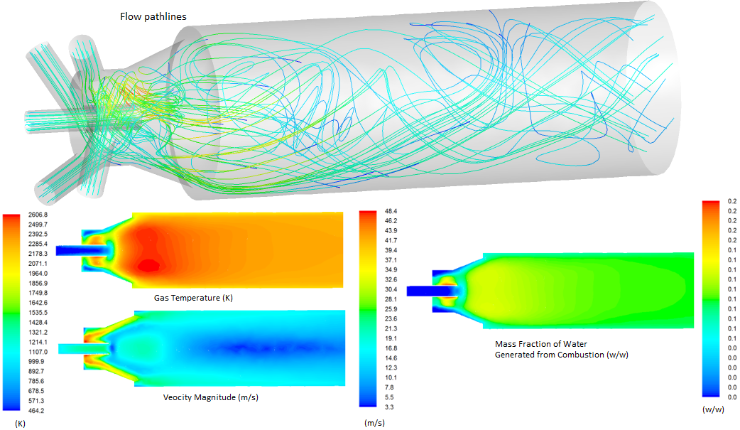 Performance of a non-premixed burner design was evaluated. It comprises four inlet air streams with centrally injected fuel stream comprising 25% methane and 75% hydrogen.